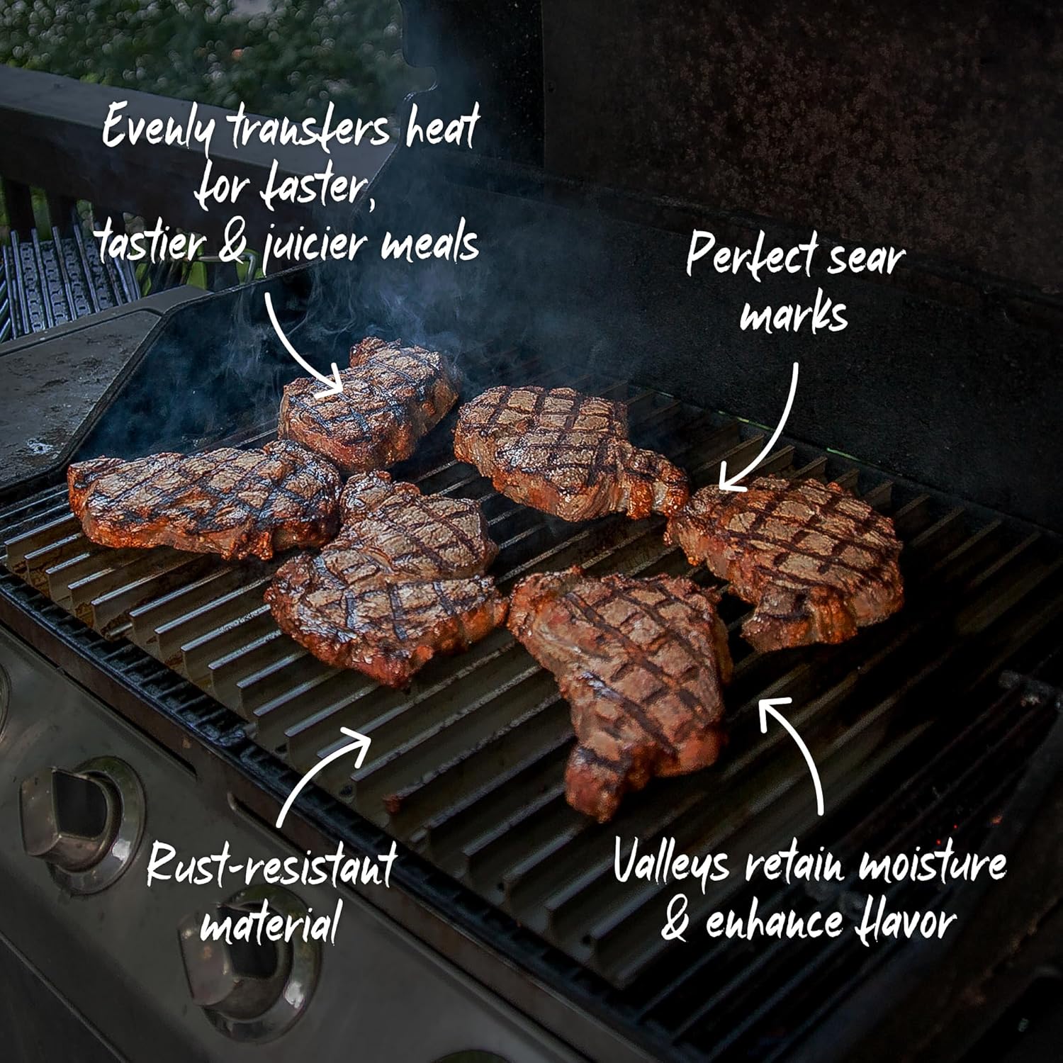 The best grilling accessory for any gas, pellet or charcoal grill. Practically universal, this set will fit any grill at least 15.25” deep. Just throw it on top of your existing grates and let it preheat for 5 minutes and you’re ready to grill the best food of your life. Nobody wants a burnt or dry meal. Flare-ups can quickly ruin any backyard cookout. At GrillGrate, we believe that grilling should be easy, fun, and stress-free – every time. All you need is the best grilling accessories to make that happen. Grilling vegetables has never been easier or more fun. The vegetables sit right on top of the flame, searing them with flavor and getting those awesome grill marks. Fits all grills, gas, charcoal, and pellet. Fits grills 15.25” or deeper. 13” tall, 15.5” wide grate area. No more having to use a separate veggie basket or foil. Just use the GrillGrate. No more wasted space on your grill. The entire grate surface is usable. Hassle-free, easy clean up. Throw it in the dishwasher. Grilling fish will never be the same. The drainage holes allow any extra oil or fluids to drain away, leaving you with a perfectly cooked fish every time. GrillGrate can be used in multiple configurations. Use it flat for grilling burgers, dogs, steaks, kabobs, etc. Use it at an angle for roasting or searing. Use the hooks to hang things like sausage or peppers from. The options are endless and limited only by your imagination. Stop using so much propane or charcoal. The GrillGrate will allow you to use less fuel and get better results.