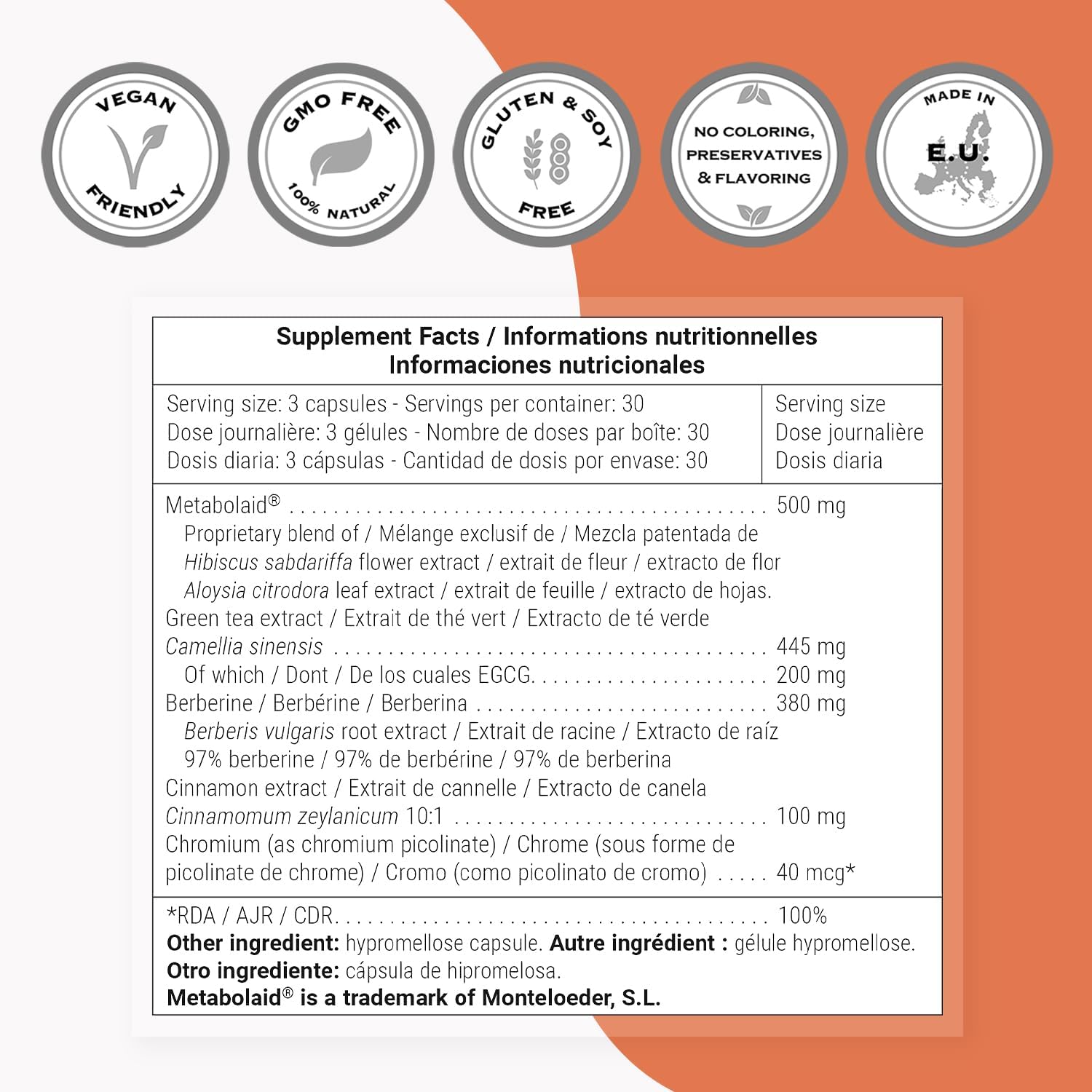 | Special Ingredients | Berberine Berberis vulgaris root extract with 97% berberine, Camellia sinensis green tea extract Of which EGCG, Chromium (in the form of chromium picolinate), Cinnamon extract Cinnamomum zeylanicum 10:1, Metabolaid® Exclusive blend of Hibiscus sabdariffa flower extract and Aloysia citrodora leaf extract |