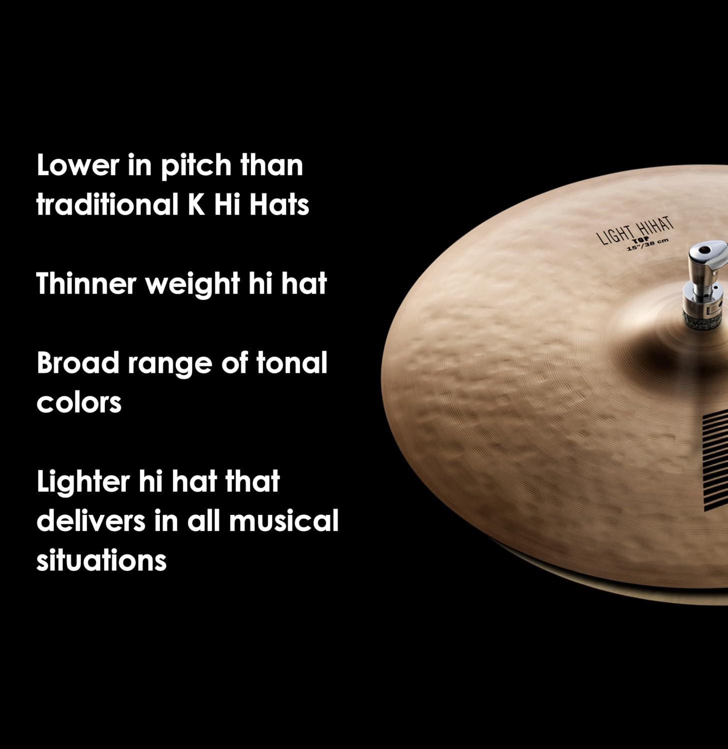 K Light Hi Hats have a broader range of tonal colors, and are lower in pitch and thinner than traditional K Hi Hats. Though thinner in weight, K Lights perform in any musical situation. The wide selection of 13" - 16" lets you decide how dark you want to get, with larger sizes offering more volume and wash for a "sloshy" feel.