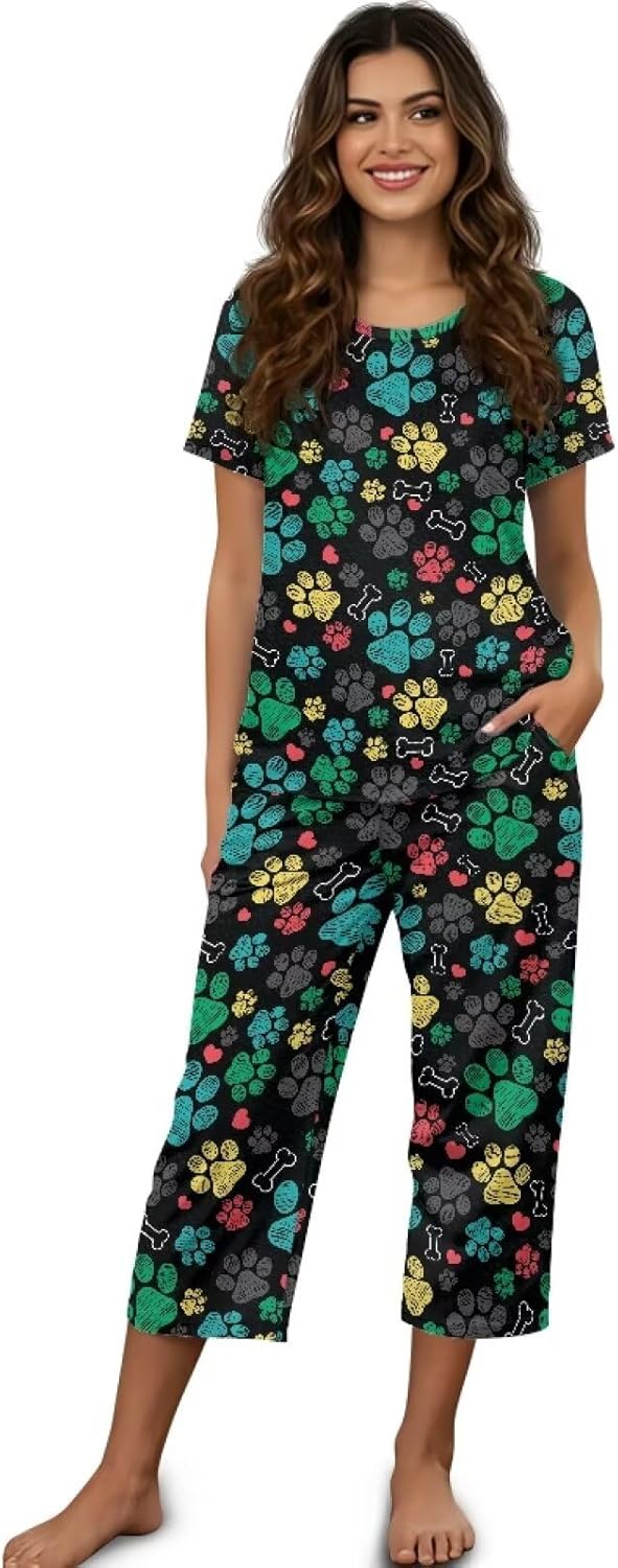 AFPANQZ Womens Pajama Sets Include Short Sleeve Pjs Tops with Long Pants, Casual Sleepwear Lounge Set with Pockets,S-4XL -Chic 2-Piece Pajama Set includes a short sleeve round neck top and wide-leg pants, -combining comfort with casual style for everyday relaxation. -The relaxed silhouette and wide-leg trousers of 2 piece lady sleepwear lounge set for women provide freedom of movement and style, -The loose night sleep shorts make your family wander more comfortable and elegant. -Making it ideal for home lounging, casual errands, or even working from home. -Stylish and practical pajama sets, designed for a fitted and comfort, this outfit is a go-to pj sets for woman all year round. -Suitable for lounging & walking dogs & shopping & sleeping & party etc, it will bring you a satisfied and comfortable and lazy home experience. 【Washing Method】 Hands wash and machine wash are acceptable, do not soak for a long time, do not bleach, the temperature of the washing liquid should not exceed 45ºC.