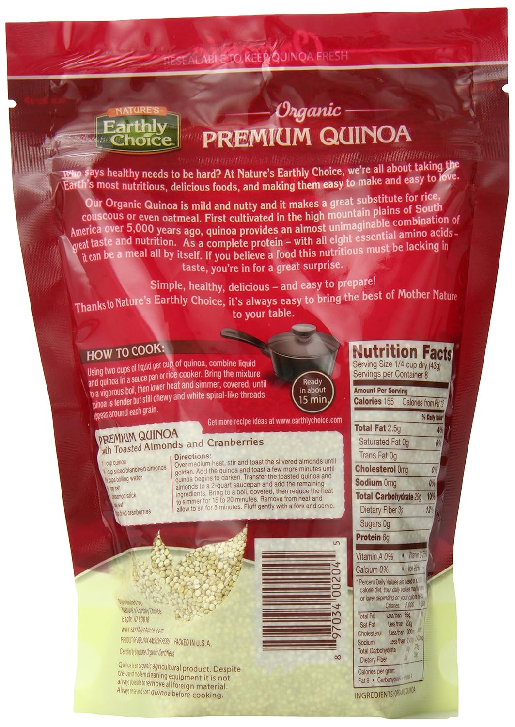 Nature's Earthly Choice Organic Premium Quinoa, Complete Protein, Good Source of Fiber & Iron, USDA Certified Organic, Gluten Free & Non-GMO, 12 Ounce (Pack of 6)